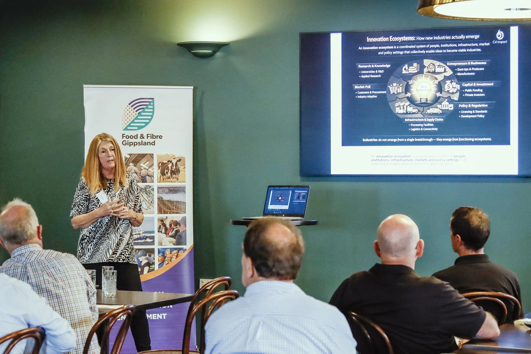 Attendees were treated to a series of engaging presentations from FoodBank Victoria, RDV Gippsland, Food & Fibre Gippsland, and C4 Impact, each offering valuable insights into current projects and future opportunities. These conversations were complemented by a delicious lunch showcasing local Gippsland produce, reinforcing the strong connection between circular economy principles and local food systems.